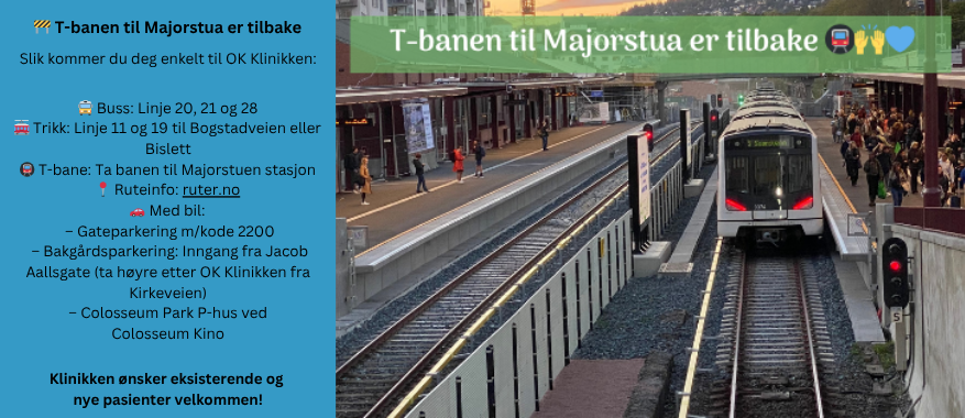 Det er igjen veldig lettvint å komme til Majorstuen, og OK klinikken ligger bare ca. 200 meter derfra.